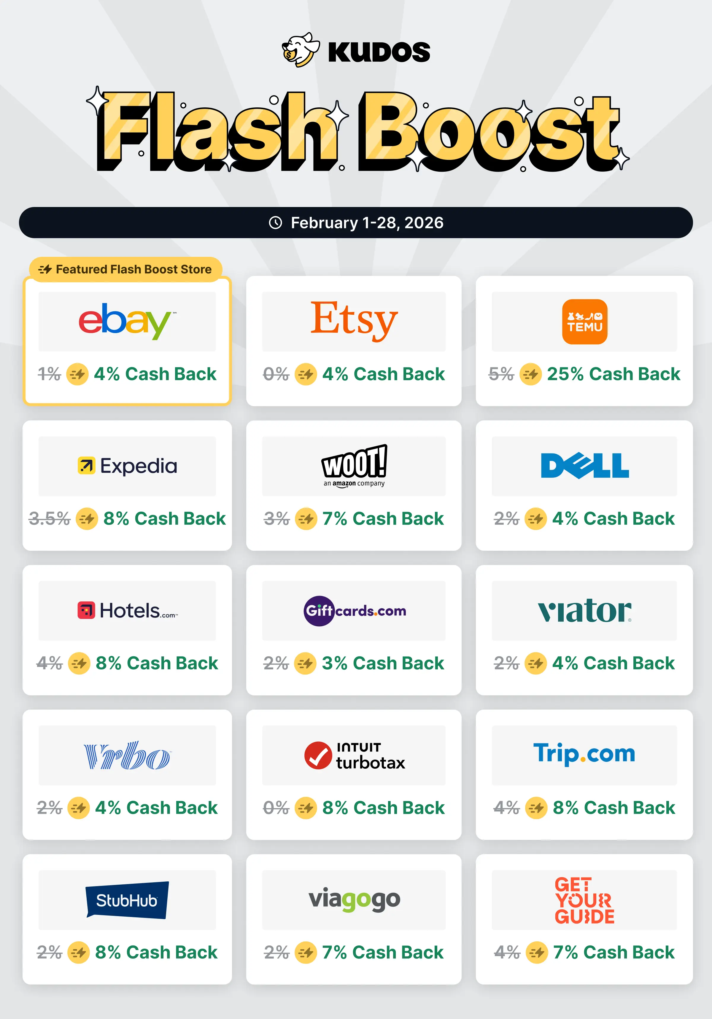 February is here, and whether you're planning Valentine's getaways, tackling tax prep, or just shopping smarter, we've got elevated cashback rates across travel, shopping, experiences, and more. Our February Flash Boost runs through February 28th with rates climbing as high as 25% cash back at select stores. Your credit card earnings stay exactly as they are, and Kudos Boost simply adds another layer on top. No trade-offs, no complications. Just more money back in your pocket.
