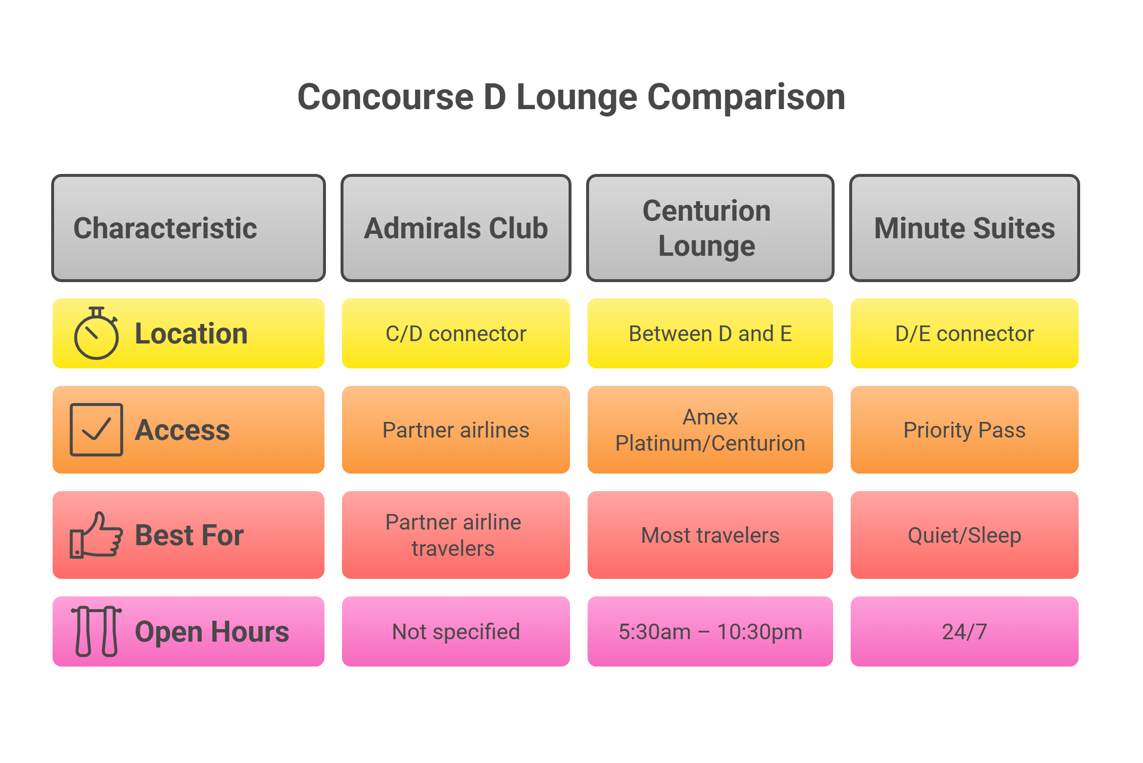If you’re flying international business or first class out of D, your ticket may grant you Admirals Club access (for AA international premium cabins or Oneworld status). Also, Priority Pass won’t help in D except for the Minute Suites, since Centurion requires Amex. So if you don’t have the airline status or Amex card, note that The Club in A is actually accessible with Priority Pass if you have time to go there (though not in D, it’s an option).