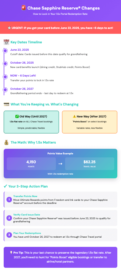 Chase Sapphire Reserve® cardholders are facing a significant change to one of the card's most valuable redemption features. If you got your Sapphire Reserve before June 23, 2025, you have a limited window to preserve the coveted 1.5x portal redemption rate on your existing points. Here's what you need to know.