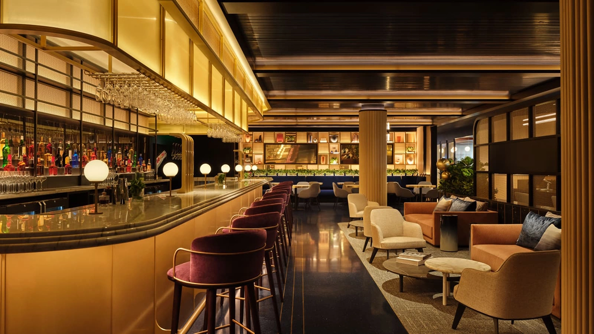 The LaGuardia location spans 21,850 square feet and features an Art Deco arcade with a vintage jukebox, extensive seating areas, and a mezzanine filled with plants.