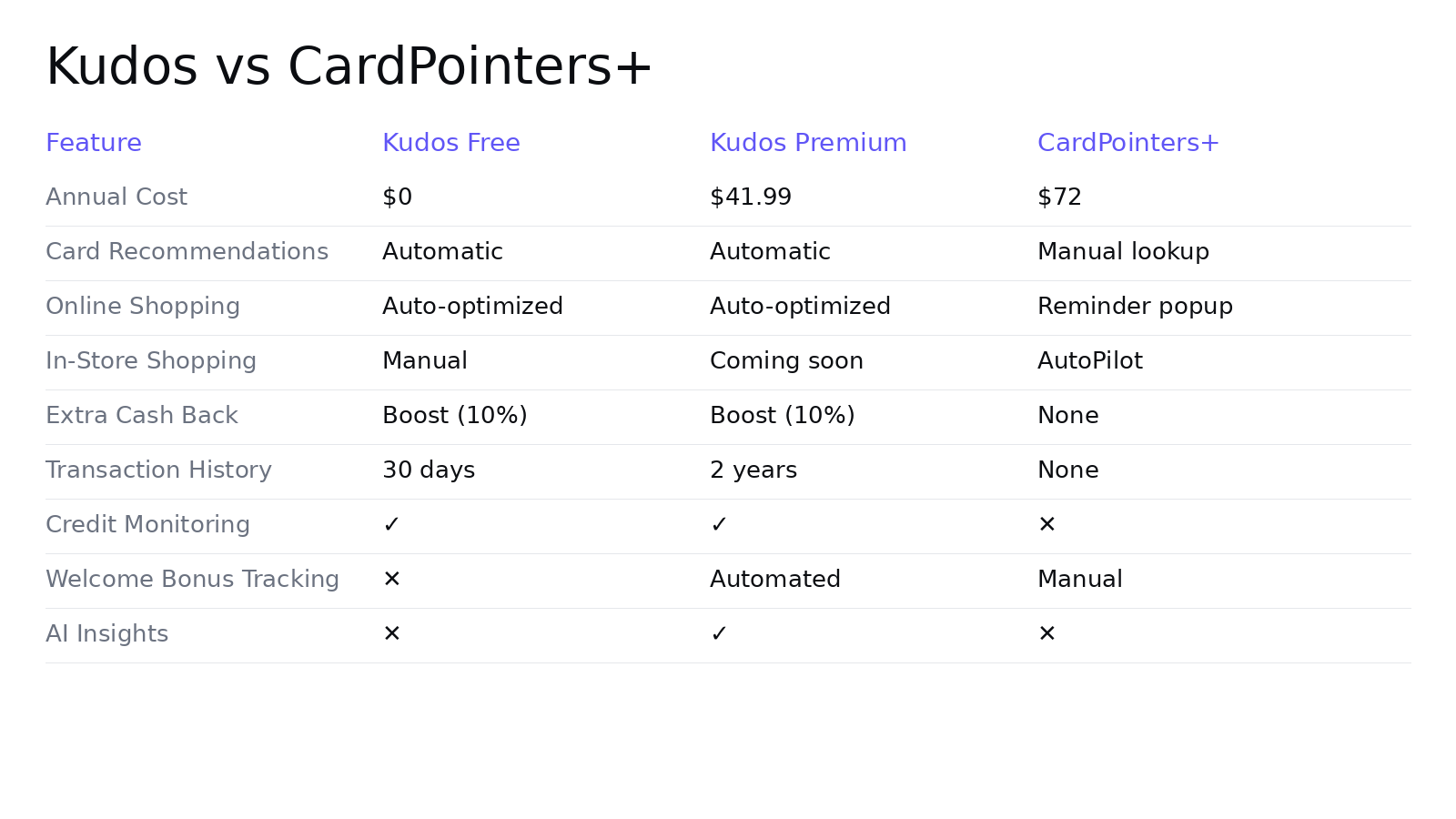 CardPointers charges $72 annually and requires you to manually check the app before every purchase. Kudos optimizes automatically at checkout—free. Want advanced features like welcome bonus tracking and AI insights? Kudos Premium costs $41.99/year (42% less than CardPointers). This comparison reveals which app delivers better value at every price point.