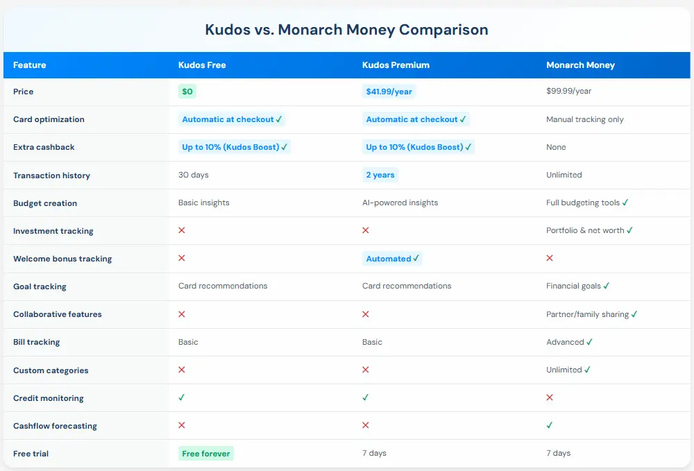 Monarch costs $99.99/year for comprehensive budgeting. Kudos optimizes credit card rewards automatically for free. Want advanced features like advanced AI insights that put your money on autopilot? Kudos Premium costs $41.99/year (58% less). This comparison reveals which app delivers better value for your financial goals.