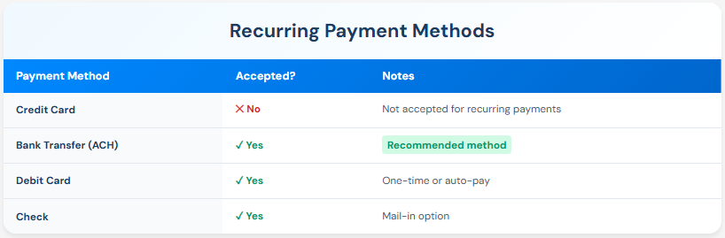 No. Carvana does not accept credit cards for recurring monthly loan payments. You must use bank transfer (ACH), debit card, or check. This is standard across auto lenders.