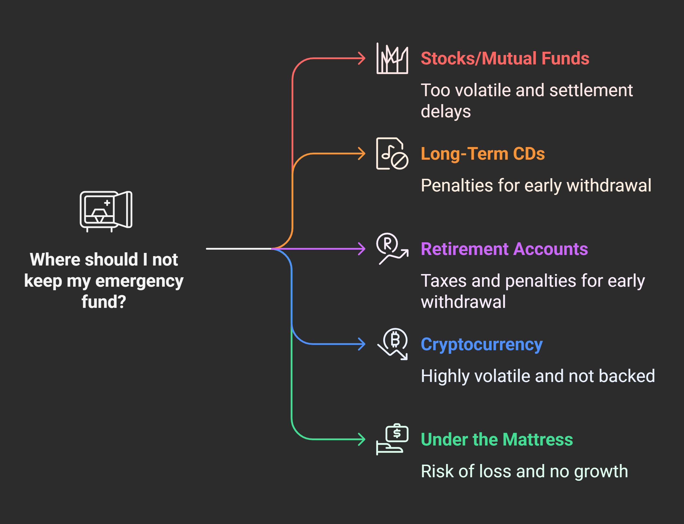 - Stocks or Stock Mutual Funds: These are too volatile. A market downturn could shrink your emergency fund right when you need it most. Plus, selling investments can take a couple of days for settlement.