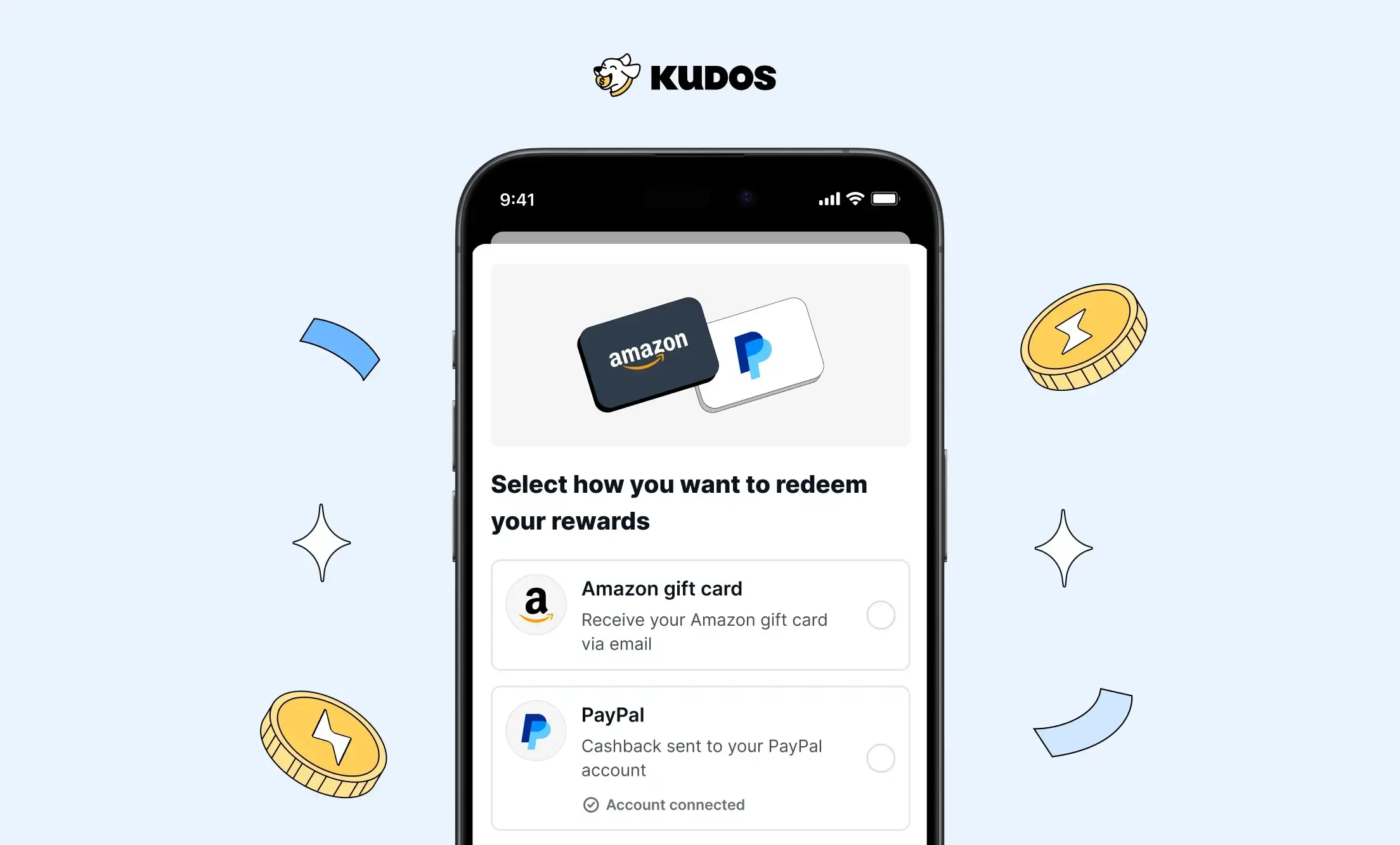 At Kudos, we believe your rewards should work the way you live. Some months you need cash for bills. Other months, you’re loading up your Amazon cart. Now you don't have to choose. You can do both. Members can now redeem their Kudos Boost for PayPal cash in addition to Amazon gift cards.
